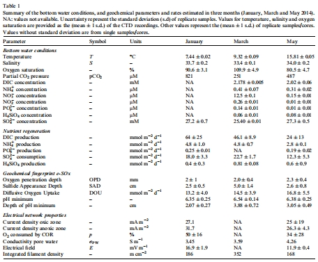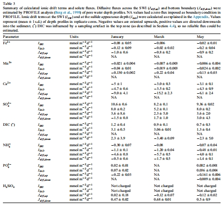 生產/消耗速率數據:通過PROFILE分析估計(圖6和表2),如DIC生產率為24-64 mmol m^{-2} d^{-1}。研究意義在于提供了e-SOx對有機質礦化貢獻的定量估計,顯示e-SOx可增強沉積物-水界面的通量。