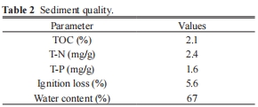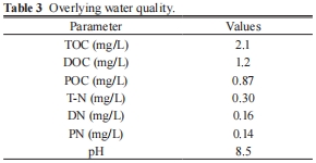 數據:表1顯示了沉積物中各元素相對于硅的摩爾比,其中硫的含量較低(0.001)。表2給出了沉積物的總有機碳(TOC 2.1%)、總氮(T-N 2.4 mg/g)、總磷(T-P 1.6 mg/g)等質量參數。表3顯示了上覆水體的TOC、DOC、營養鹽等水質參數。