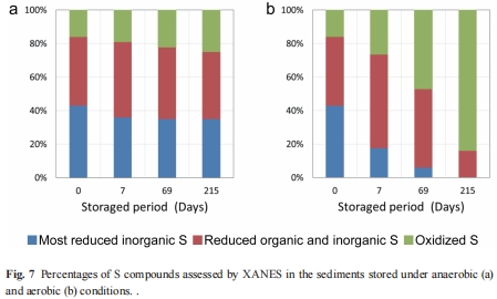 氧化條件驅動硫形態快速轉化:好氧儲存顯著促進了沉積物中還原性硫向氧化性硫的轉化,大部分轉化發生在前幾周,7個月后絕大部分硫被氧化。