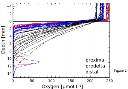 數(shù)據(jù):氧氣濃度隨沉積物深度快速下降,近端、前三角洲和遠(yuǎn)端區(qū)域的平均氧氣滲透深度(OPD)分別為1.7±0.4 mm、3.3±1.3 mm和8.2±2.6 mm。部分剖面顯示生物擾動引起的氧氣峰值。