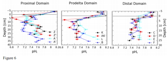 數(shù)據(jù):pH在沉積物-水界面下方立即下降0.6-0.7單位,在OPD以下出現(xiàn)拐點并緩慢回升至7.4-7.6。近端區(qū)域pH梯度更陡。