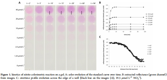 數據:Figure 1A-C顯示,Griess反應在10分鐘內完成,顯色穩定;濃度梯度(1.25-40 μmol L?1)下反射強度線性相關(r2=0.9972),梯度邊緣擴散可忽略。