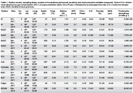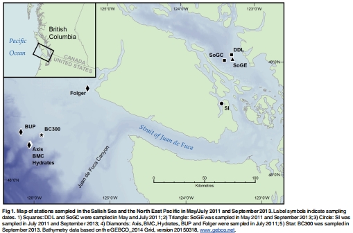采樣設計:在2011年5月、7月和2013年9月,使用ROV ROPOS在東北太平洋和薩利希海的10個站點采集沉積物巖心(深度范圍96-987米)。站點覆蓋了從缺氧區(qū)(OMZ)到富氧水域的自然梯度(Fig 1)。