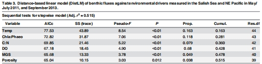 數(shù)據(jù):Table 3顯示DistLM模型中,溫度貢獻16.3%通量變異,葉綠素a/褐藻素比11.8%。Table 4和Fig 3的dbRDA圖揭示了溫度和DO是主要驅動因子。