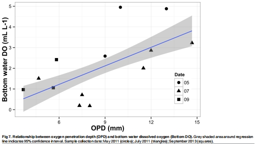 數(shù)據(jù):使用Unisense電極測量OPD,范圍3.7–13.0 mm。Fig 7顯示OPD與DO正相關。
