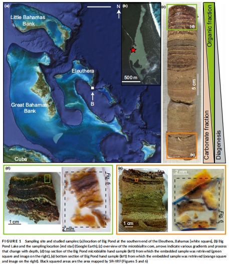 本論文研究了超鹽湖Big Pond Lake(巴哈馬)中微生物巖在早期成巖過程中金屬分布的模式。摘要指出,金屬作為化石疊層石記錄中的生物標志物應用需理解其初始結合和成巖保存過程。通過結合同步輻射X射線微熒光(SR-μXRF)、共聚焦和雙光子顯微鏡等多尺度技術,研究發現:在活躍微生物巖表層,金屬通過被動結合到有機基質(如EPS)均勻分布;隨著早期成巖進行,代謝活動減弱,金屬被重動員并富集為硫化物,呈現異質性分布,與微生物巖的層理對齊。研究還識別出富含Mn、Cu、Zn和As的球狀體,可能由微生物活動產生。Big Pond微生物巖與太古代Tumbiana疊層石的金屬分布相似性,為微生物巖生長、早期成巖和化石化的金屬演化提供了概念模型。