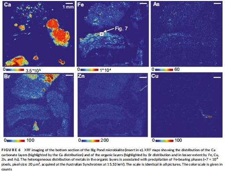 化石記錄應用:金屬分布模式(如球狀體熱點)與太古代疊層石相似,支持金屬作為微生物活動的潛在生物標志物。