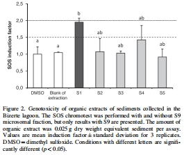 數(shù)據(jù):Figure 2顯示SOS chromotest中S1提取物遺傳毒性最強(qiáng)(誘導(dǎo)因子1.95);Table 2顯示Microtox水提液毒性S3最高(EC50 80.6 mg/mL)。