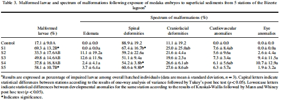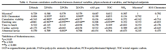研究意義:這些數(shù)據(jù)揭示了站點(diǎn)的污染梯度,S1站點(diǎn)污染最重(高TOC和PAHs),為毒性差異提供化學(xué)解釋。污染物濃度與生物效應(yīng)(如畸形率)的相關(guān)性(Table 4)突顯了特定化合物(如PAHs)的主導(dǎo)作用。