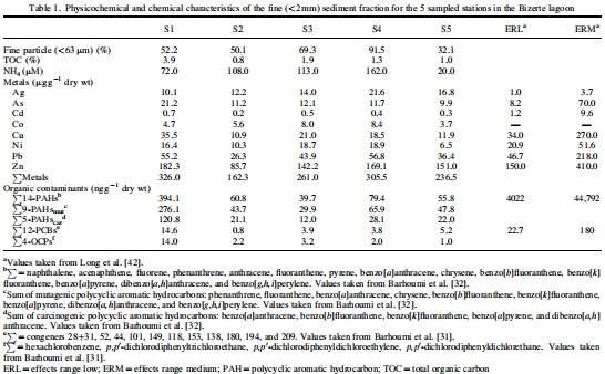 數(shù)據(jù):Table 1列出了各站點(diǎn)的粒度(<63 μm占比32.1-91.5%)、總有機(jī)碳TOC(0.8-3.9%)、銨鹽(NH?, 20-162 μM)、重金屬(如Pb 26.3-55.2 μg/g)和有機(jī)污染物(如ΣPAHs 39.7-394.1 ng/g)。