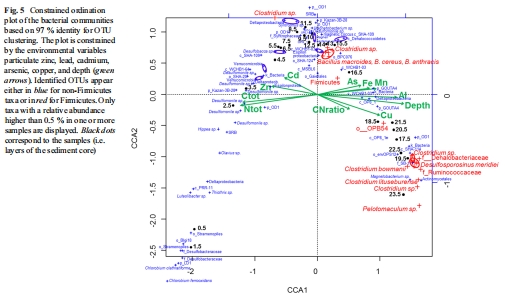 數據:Fig. 5 的CCA圖顯示樣本按深度分組,金屬濃度(如Zn)和深度是群落結構的主要驅動因子;Firmicutes在深層樣本中聚集,與高C/N比和低營養相關。