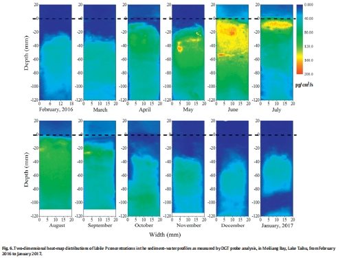 數據描述:圖6的熱圖顯示DGT-labile P在6-7月濃度最高,且高值區靠近沉積物-水界面。