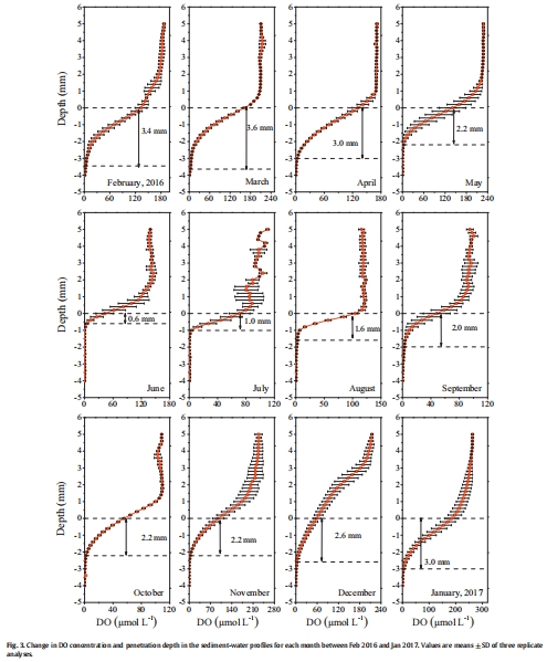 數據描述:圖3顯示DO滲透深度(OPD)從冬季3.4 mm降至夏季0.6 mm;圖4顯示Eh隨深度降低,但表層Eh>300 mV。