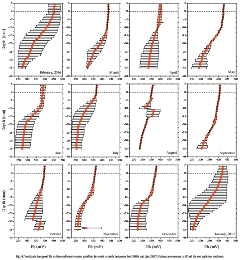 Eh剖面(圖4):Eh隨深度降低,但表層均值>300 mV,表明沉積物表層整體氧化態,但厭氧層在溫暖季快速上移。