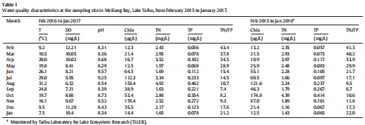 數據描述:表1顯示,Chla濃度從開花前期(2月12.3 μg/L)升至開花期(8月153.4 μg/L),TN/TP從43.4(2月)降至7.4(9月)。