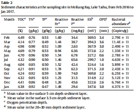 數據描述:表2包括沉積物TOC、TN、TP、反應性Fe/P及細菌豐度等月度數據。例如,反應性Fe在4-6月極低,而細菌豐度在3月峰值(11.4×1011 copies/g)。