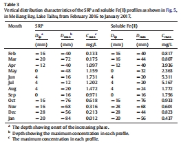 數據描述:圖5顯示SRP和Fe(II)濃度隨深度增加,夏季(6月)峰值SRP達1.73 mg/L,Fe(II)達5.31 mg/L;表3匯總剖面特征參數(如Dip、Dmax、Cmax)。