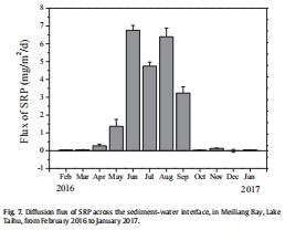 數據描述:圖7顯示SRP通量月度變化,6月最高(6.76 mg/m2/d),12月最低(-0.01 mg/m2/d)。