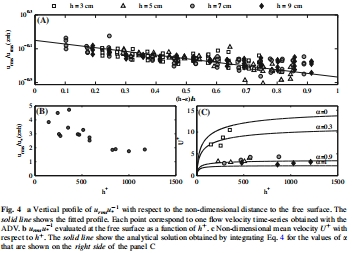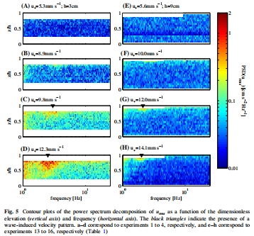 數(shù)據(jù)描述:圖4a顯示湍流強度(urms/u?)隨深度減小,表明湍能源于水面;圖5功率譜顯示表面波影響僅限于上層(z/h > 0.5),對底部kt無顯著影響。