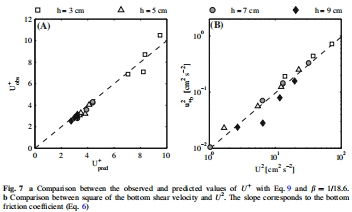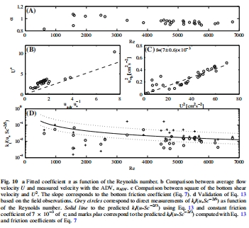 數(shù)據(jù)描述:圖7a通過擬合速度剖面確定β=1/18.6;圖7b得摩擦系數(shù)f≈9.7×10?3;圖8b顯示kt/(u?Sc?2/3)與Re?1線性相關(guān)(r=0.93),驗證式13;圖10d野外數(shù)據(jù)進(jìn)一步驗證模型。