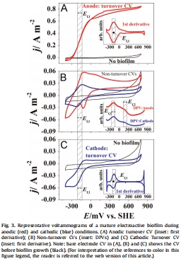 論文摘要指出,本研究通過電化學表征(循環伏安法CV和差分脈沖伏安法DPV)探討了電活性生物膜中雙向電子轉移的機制。實驗首先在陽極條件下(乙酸氧化,電極電位+397 mV vs. SHE)培養成熟生物膜,然后切換至陰極條件(硝酸鹽還原,電極電位-303 mV vs. SHE)。結果表明,乙酸氧化和硝酸鹽還原發生在相似的形式電位(約-175 mV vs. SHE),生物膜主要由Geobacter sp.組成,暗示可能使用相同的電子傳導通路進行雙向電子轉移。