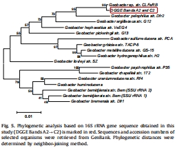 數據:DGGE譜圖顯示Geobacter sp.為優勢菌(帶寬相對強度在陽極條件下為16.8%,陰極條件下為27.4%);其他菌如Rhodocyclaceae在陽極條件豐富(16.7%),但陰極條件下消失,而Synergistetes在陰極條件增加至26.0%。系統發育樹(圖5)確認Geobacter sp.與已知菌株相似度>99%。
