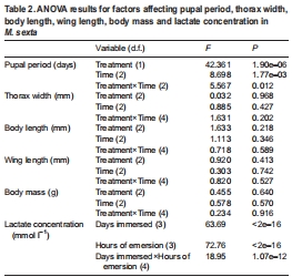 使用R語言進(jìn)行ANOVA和t檢驗(yàn),分析浸水時(shí)間與處理對(duì)存活率、成蟲形態(tài)(體長、翅長等)及乳酸動(dòng)態(tài)的影響(Table 2)。