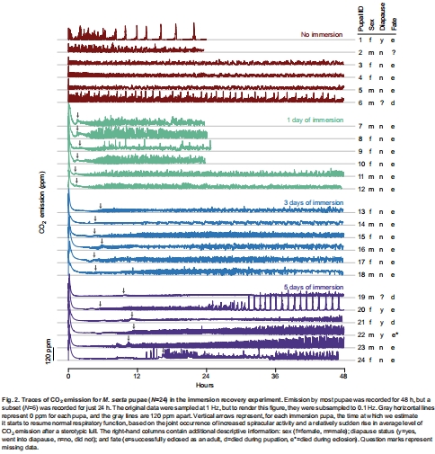數(shù)據(jù):Fig. 2展示24個(gè)蛹的CO?軌跡,顯示恢復(fù)期三階段:初始高峰(5-10分鐘)→ 低谷 → 周期性排放(振幅與頻率隨浸水時(shí)間延長而增加)。Fig. 4每小時(shí)平均代謝率表明,浸水蛹的CO?排放率在恢復(fù)期持續(xù)升高(1天組峰值在10-12小時(shí),3/5天組持續(xù)48小時(shí))。