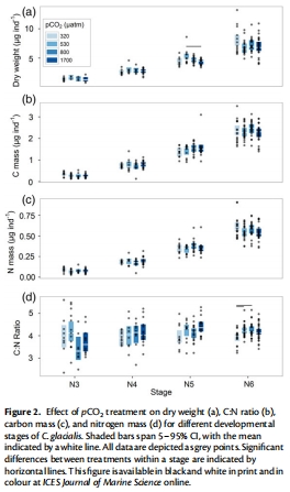 數據:Figure 2A、2C和2D顯示干重從N3的1.5±0.1 μg/個體增至N6的7.1±0.2 μg/個體,碳和氮質量同步增加。除N5階段干重在高壓pCO?略低外(p<0.02),其他階段無差異。C:N比(Figure 2B)在N6階段低pCO?處理中略低,但無一致趨勢。