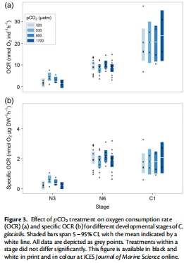 耐受性證實:C. glacialis早期發育階段(卵到C1)對pCO?升高(直至2300年預測水平)不敏感,發育率、生長和代謝均未受影響。