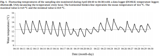 樣本收集:2014年4月從法國羅納河故道(5°09'E, 45°48'N)采集約250只懷卵Gammarus roeseli雌體,自然水溫波動在10.9–14.9°C(Fig. 1)。