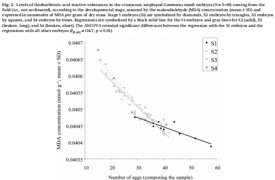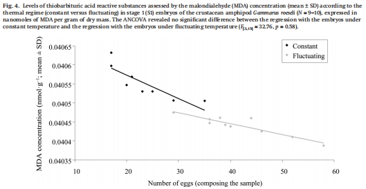 數(shù)據(jù):Fig. 4比較CTR與FTR下S1胚胎的TBARS水平,CTR組略高(ANCOVA, p = 0.038),但回歸斜率無差異。