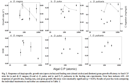 論文摘要指出,食物碳磷比(C:P)不僅在高值時(如>250-300)會抑制消費者生長,低值時(如<120)也可能產生負面影響,這種現象被稱為“化學計量刀鋒效應”。本研究以三種水蚤(Daphnia magna、D. pulicaria 和 D. pulex)為模型,喂養C:P比范圍廣泛(原子比<50至>1500)的綠藻Scenedesmus acutus,測量其生長率、攝食率和呼吸率。結果發現,所有物種在食物C:P過高或過低時生長均減慢,呼吸率增加,表明代謝成本上升;攝食率在低C:P食物上反而升高。這些結果提示,食物C:P失衡通過增加能量消耗影響水蚤性能,低C:P的負面效應在富磷湖泊中可能起重要作用,需納入浮游生物營養相互作用模型。