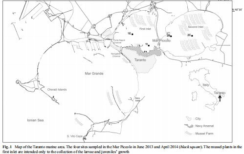 采樣設(shè)計(jì):在Mar Piccolo的兩個(gè)入口選擇四個(gè)站點(diǎn)(Fig. 1),代表不同污染梯度(如St. 1E近航道,St. 1I近兵工廠)。2013年6月和2014年4月進(jìn)行兩次采樣,使用多管采樣器收集沉積物巖心。