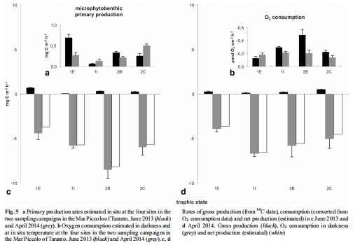 營養(yǎng)狀態(tài):Mar Piccolo底棲系統(tǒng)凈異養(yǎng),初級(jí)生產(chǎn)力低下,可能因污染物積累抑制微生物代謝;氧消耗數(shù)據(jù)證實(shí)生態(tài)系統(tǒng)能量失衡。