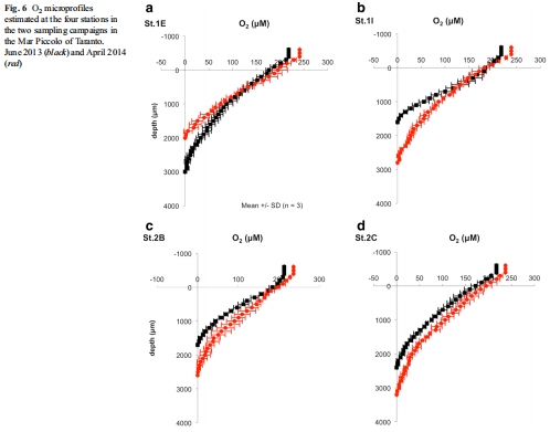數(shù)據(jù):Table 1提供了底部水溫(15.44–22.24°C)、鹽度(36.81–38.37 psu)、氧飽和度(98.5–159.2%)等;Fig. 3通過氧微剖面顯示氧滲透深度(OPD),例如St. 1I站點(diǎn)OPD淺(約1.5 mm),表明缺氧壓力。