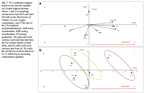 數(shù)據(jù):Fig. 7的PCA圖顯示污染物(如PCBs、Hg)與微生物豐度負(fù)相關(guān);St. 1I站點(diǎn)聚集在高污染區(qū)域。