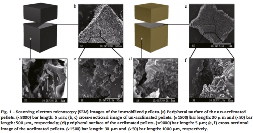 數據:Fig. 1 的SEM圖像顯示,未馴化顆粒表面孔隙多但細菌稀疏(圖1a-c),而馴化后顆粒表面覆蓋密集桿狀菌生物膜(厚度80-120 μm),截面顯示細菌主要分布于外層(0-300 μm)(圖1d-f)。