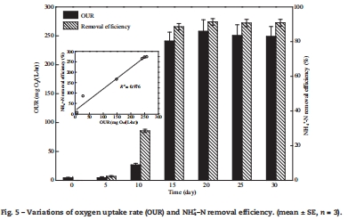 數據:Fig. 5 顯示OUR在馴化15天后從26.62 mg O?/(L·hr)升至240.83 mg O?/(L·hr),與NH?-N去除效率正相關(R2=0.976);氧微剖面(Fig. 3-4)表明氧氣在0-300 μm深度內快速消耗(梯度0.035 mg O?/(L·μm)),600 μm以深接近缺氧。
