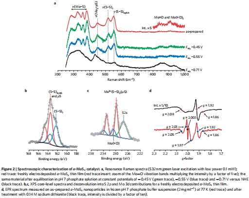 EPR(圖2d):在制備態(tài)a-MoS?中檢測到兩種Mo??信號(g⊥=1.92, g∥=1.86對應(yīng)Mo??=O;g?=2.05, g?=2.01, g?=1.97對應(yīng)Mo??-S),以及g=2.003的有機自由基信號。