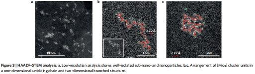 HAADF-STEM(圖3):直接觀察到[Mo?]簇以鏈狀或二維網(wǎng)絡(luò)排列,Mo-Mo間距(2.1 ?)與[Mo?S??]2?簇匹配。