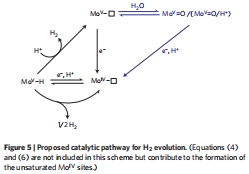 預(yù)催化還原峰(圖4a-b):在HER前出現(xiàn)兩個還原峰(E?????=-0.44 V, E?????=-0.54 V vs. NHE, pH 7),分別對應(yīng)Mo??(S?)和{Mo??=O/H?}缺陷的還原(方程1-2)。
