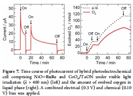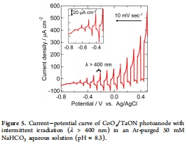 數據來源:圖1顯示NiO-RuRe光陰極在CO2飽和的含水溶液(pH 6.6)中的電流-電位曲線(λ = 460 nm照射);圖5顯示CoOx/TaON光陽極在Ar氛圍含水溶液(pH 8.3)中的電流-電位曲線(λ > 400 nm照射)。