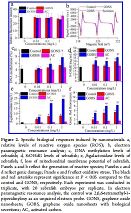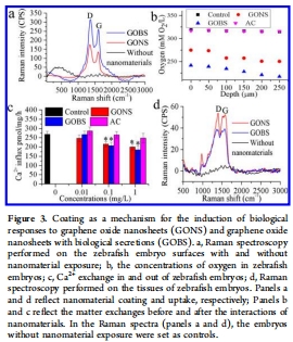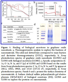 GOBS制備與表征:將GONS與斑馬魚培養(yǎng)液中的分泌物混合,通過離心和冷凍干燥獲得GOBS;使用熱重分析(TGA)、X射線光電子能譜(XPS)、SDS-PAGE等技術(shù)分析結(jié)合成分(如蛋白質(zhì)、多糖、DNA)。