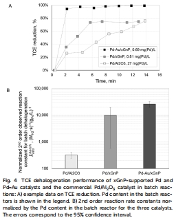 數據來源:圖4A顯示TCE濃度隨時間下降曲線(Pd-Au/xGnP在2分鐘內去除90%);圖4B比較二階速率常數(Pd-Au/xGnP: 26309 MH??1 s?1 gPd?1 L)。