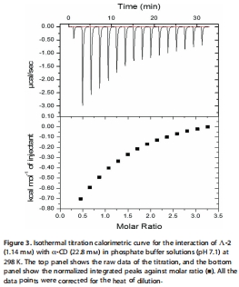 數據來源:Figure 3顯示Λ-2與α-CD的等溫滴定 calorimetry曲線,擬合得到1:1化學計量比(N=1.09)和結合常數K=3390 L mol?1。