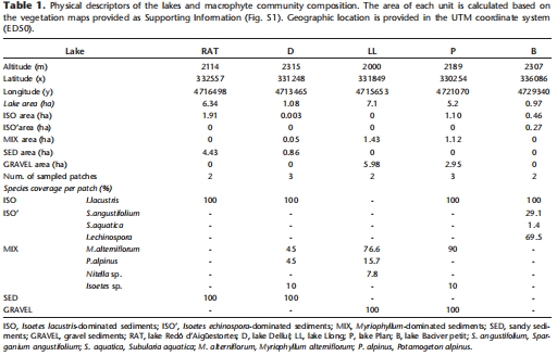 選取西班牙比利牛斯山脈五個高山湖泊(海拔2000-2300 m),涵蓋不同植物群落:Isoetes主導(高ROL)、混合植物(MIX, 低ROL)、無植被沙質(SED)和礫石沉積物(GRAVEL)。采樣點分布如圖1所示。