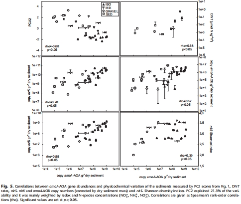 數據來源:圖3比較不同沉積物中基因拷貝數(如amoA-AOA在ISO中最高);圖4顯示DNT和DEA速率(ISO沉積物DNT速率最高,0.017-0.4 μmol N kg?1 h?1)。