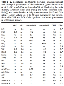 數據來源:圖5顯示amoA-AOA豐度與PC2得分(加權于氧化還原和營養鹽)、DNT速率、nir基因豐度顯著相關;表2列出基因與環境參數的相關性(如amoA-AOA與NO?正相關,rho=0.7)。