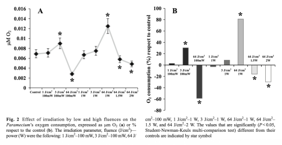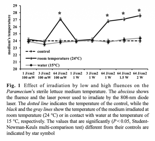 1 808納米、64 J/cm2-1 W激光療法比3 J/cm2-100 mW更能高效增強草履蟲線粒體呼吸鏈活動,且效果不受約3°C溫度變化影響。